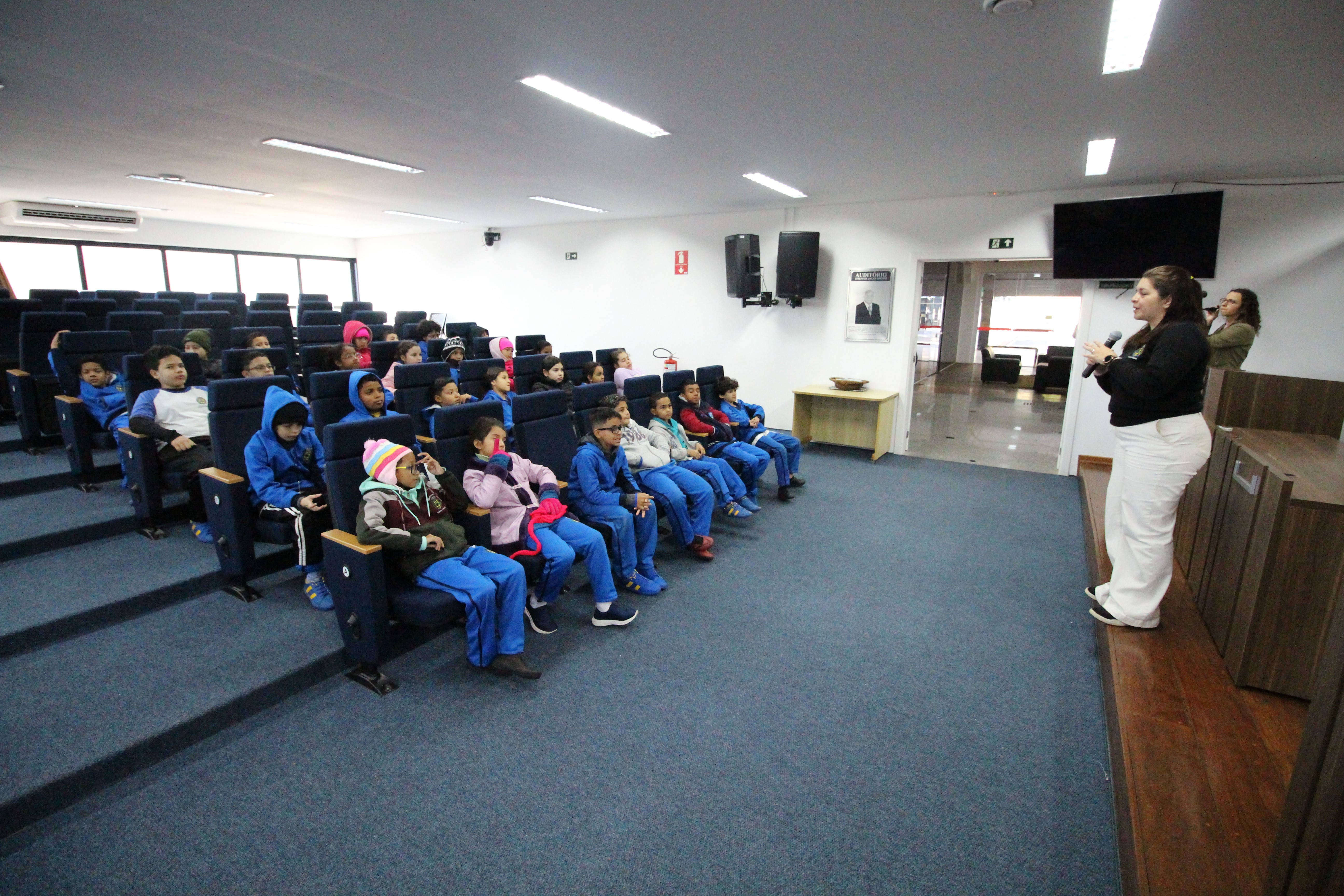 Após serem recepcionados, os alunos da Frederico Pagotto foram conhecer a sala da presidência, as salas administrativas, o estúdio de TV e os gabinetes dos demais vereadores. No dia de hoje, o vereador Clayton conversou com as crianças.