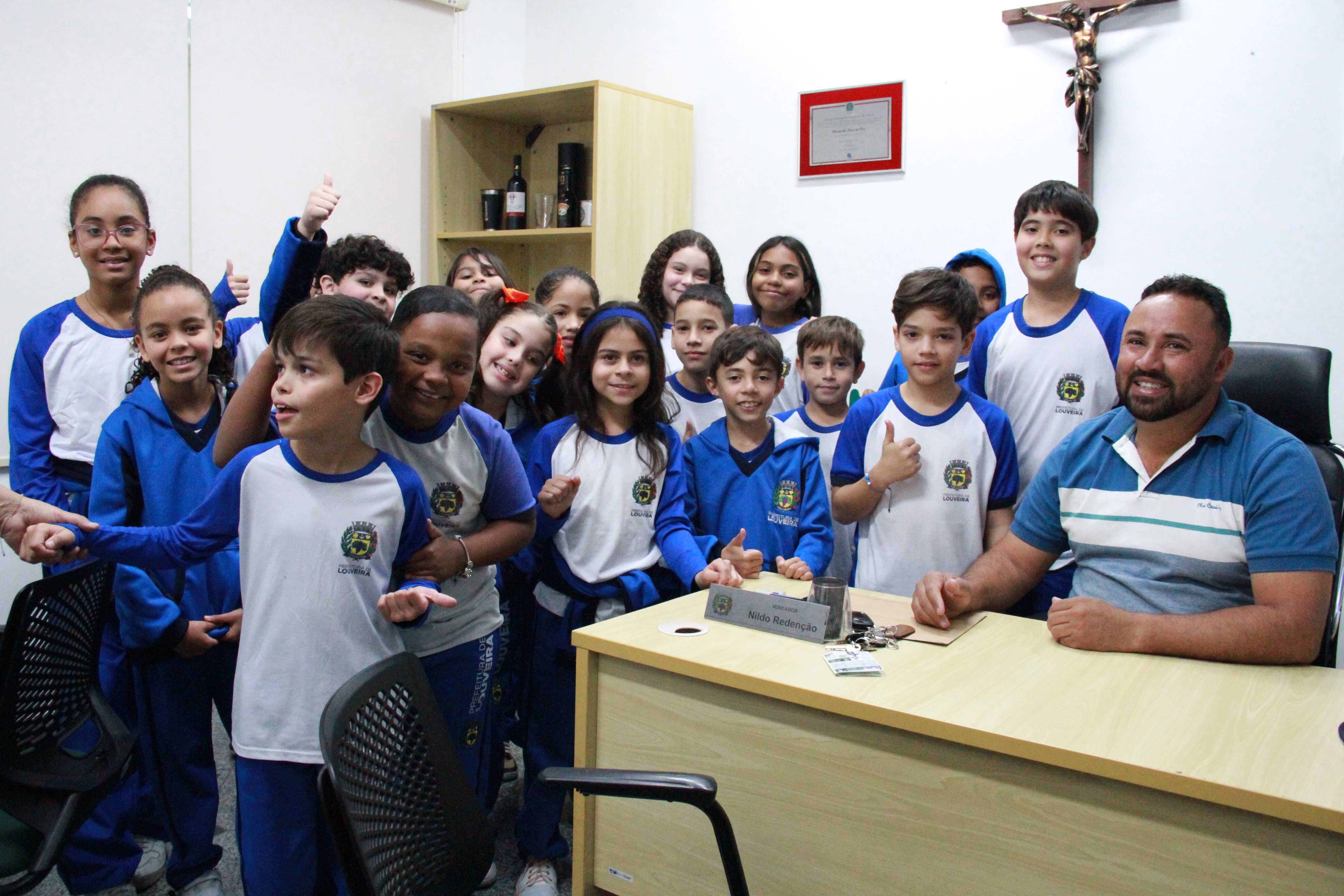 Os alunos da Melissa Sicalhone do 4º ano C e D tiveram a oportunidade de conhecer as dependências da sede do Poder Legislativo e participar de um bate-papo sobre o funcionamento da Casa. Após a recepção e pose especial para as fotos, as crianças passam pela sala da presidência, a parte administrativa, o estúdio de TV e os gabinetes dos demais vereadores. Nesta quarta, os vereadores Kaká Rodrigues, Leandro Lourençon, Clayton, Nildo Redenção, Júlio Cezar e Gilberto Piska receberam as crianças em seus gabinetes.